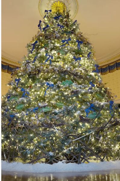 Η Πρώτη Κυρία αποκάλυψε ότι το επίσημο χριστουγεννιάτικο δέντρο του Λευκού Οίκου στο Μπλε Δωμάτιο, είναι ένα έλατο 5 μέτρων από την Πενσυλβάνια στολισμένο με χειροποίητες απεικονίσεις των επίσημων πτηνών της πολιτείας σε χρώματα μπλε, χρυσό και ασήμι.
